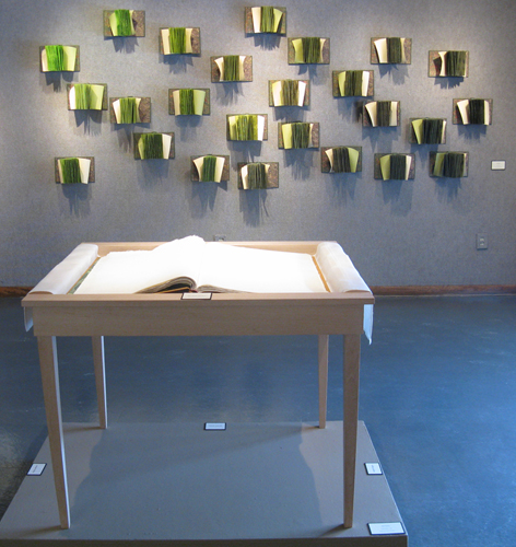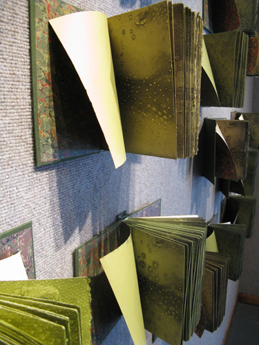 Gail Deery’s work seems to be combining many of Dieter Roth’s interests, notably his use of books and mold (Roth a Swiss-German artist spent some time in Philadelphia in the early 1960’s). In general, Deery’s work appears more orderly and contained than Roth’s whose work often appears on the verge of being out of control. In a large wall installation Deery presents books that are loosely spread open and attached to the wall. Impressions of mold in various greens appear on the pages. Although this installation elicits more questions than answers, it also provides a stirring and interactive presence in the gallery.