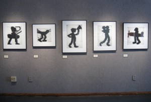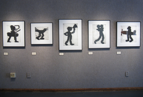 John Strawn creates shapes formed on printing plates using collagraphic techniques. The shapes become silhouettes of imagined figures and are printed in black. Close up, the figures appear raised on the surface of the paper. From a distance, these works read as one connected collection of figurative shadows.