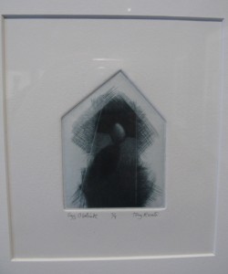 Rounding out the exhibit is a group of small mezzotints by Tony Rosati. Each print depicts a single egg in a unique environment. Like the central print in Sergei Tsvetkov installation, several of Rosati’s works are likewise printed from uniquely shaped plates. Although the titles of some of Rosati’s prints involve tongue in cheek humor, these works seem more about intimate meditation and careful attention.