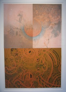 During the gallery talk opening night, I learned that Shelley Thorstensen often works on both sides of thin semitransparent paper to illicit subtle effects. This dimensional mode of working is one of a number of techniques that Thorstensen applies. Although Thorstensen’s work often alludes to forms found in nature, ultimately these works seem more about abstract relationships. After trying to decode the line work, I found myself being drawn inward to marvel at the formal and material subtleties found in her work. After a close appraisal, I realized that reproductions of her work couldn’t possibly do these prints justice.