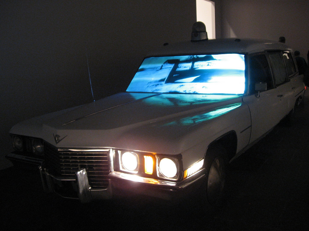 The can-do country can’t do when it comes to cultural imperialism. Kerry Tribe‘s video installation about a real-life medical failure and Bruce High Quality Foundation‘s video installation of the American Dream and its cliches in movie clips projected on the windshield of a giant white hearse–both tell the story of our cultural crash.