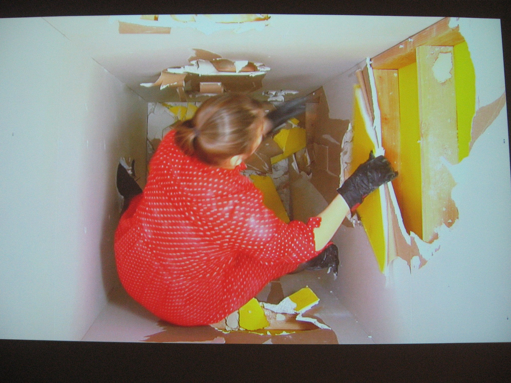 Tearing apart a constrictive room is the action in Kate Gilmore‘s video of her can-do self. And it bears comparison to the constrictive space in which Newsome’s vogue dancers perform. There’s a theme here of an America that is quite different from its own propaganda, an America that has far too long believed its own rhetoric, now proven meaningless.
