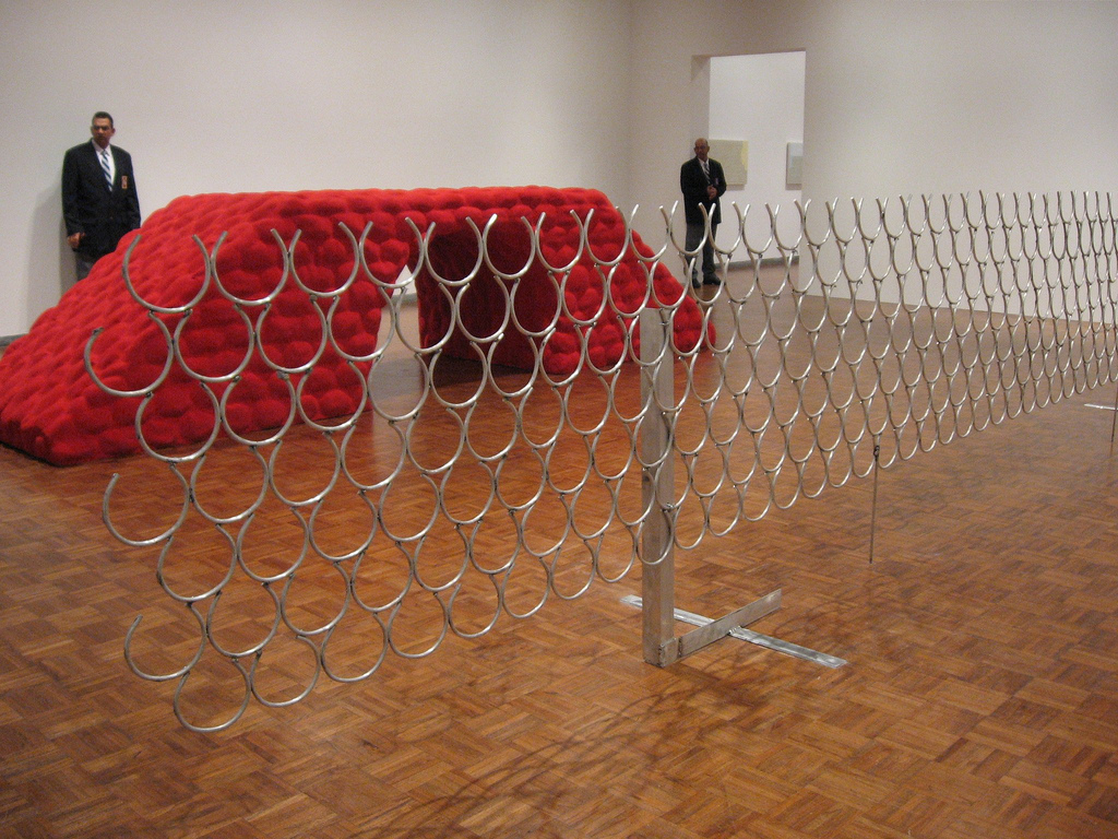 The great suburban showdown also expresses itself in sculpture, in Robert Grosvenor’s giant garden feature which ties for my official Tactility Prize along with Piotor Uklanski’s fabulous theatrical burlap hanging, which seems to belong to a different exhibit altogether. While I may not know what it’s doing here, I like it.