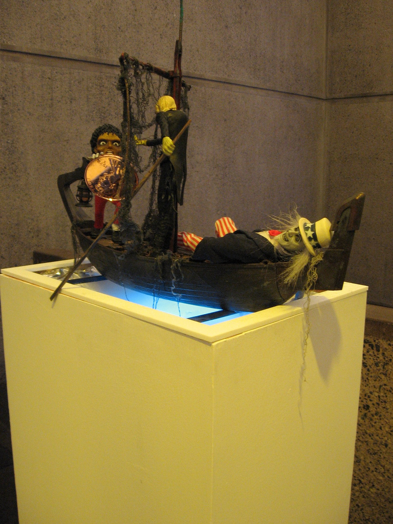 In a year when we lost the King of Pop, it’s no surprise that there’s a second Michael Jackson piece in the show. Floating on a pedestal above a glowing dry-ice miasma, Daniel McDonald’s theatrical kitschy sculpture of Jackson in the lobby transitions viewers in and out of the exhibit. Jackson is helping a poor Uncle Sam cross the River Styx by offering the boatman, Charon, a giant shiny copper penny to pay their passage. Jackson holds it up like a shield, but the shiny penny can’t shield any of us from the new world order.