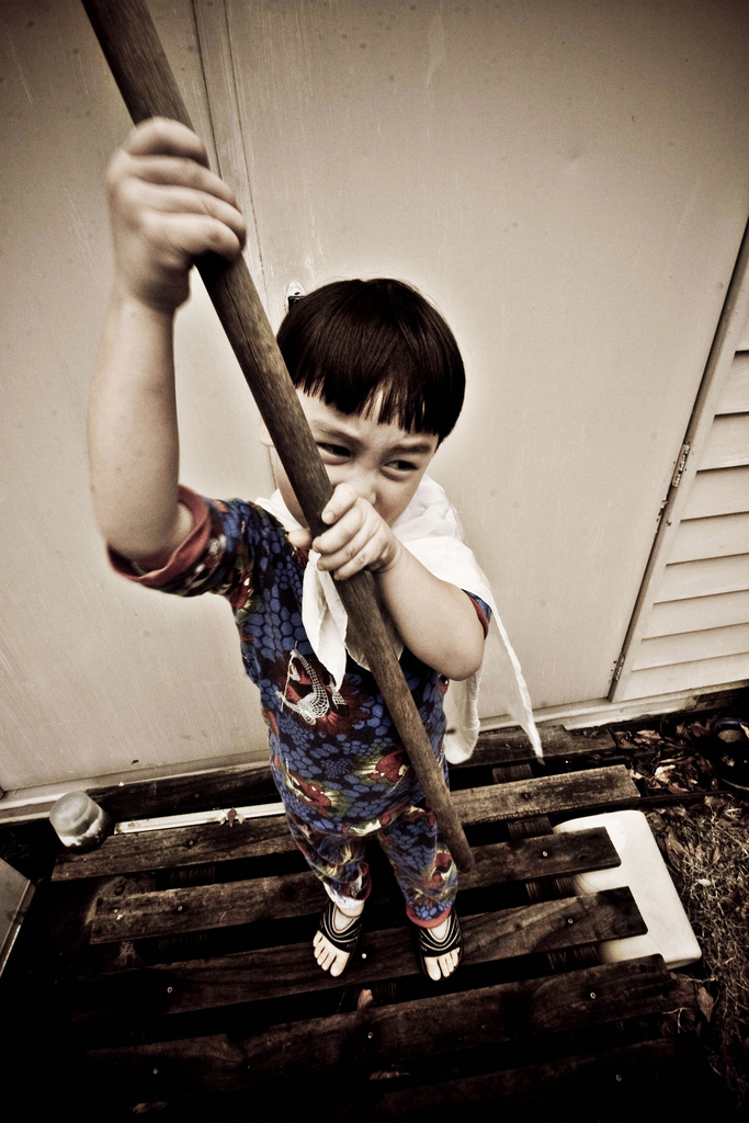 Tan Tram’s photos of a young boy imagining himself as a superhero seem like the most hopeful works in the exhibit.