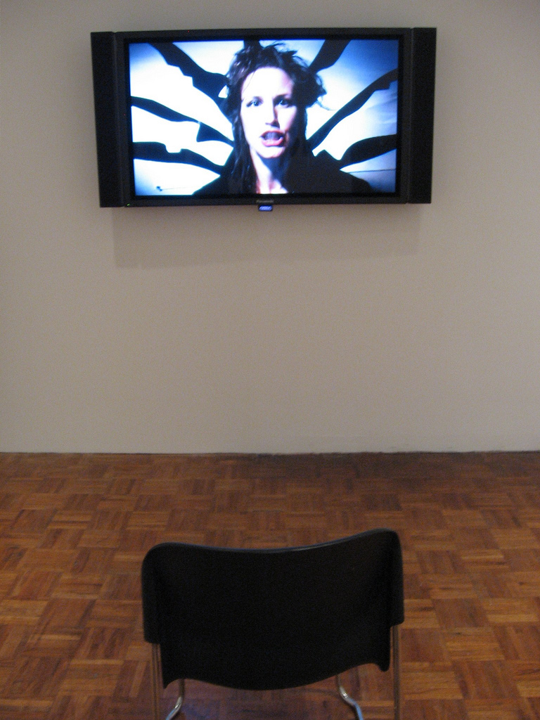 Videos were where the action was in this biennial. Marianne Vitale‘s drill-sargeant harangue, Patron, had me cowering–as intended. The lowly chair in front of the high video is the wayward student’s seat in front of the teacher. Obey your out-of-control government.