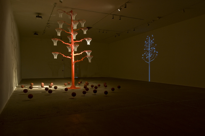 The Icebox space contained Orange Tree (2010), a towering, multi-limbed “tree” sprouting nineteen basketball hoops, rather than branches, surrounded by balls which looked liked fallen fruit. Facing it was a similar-sized video projection of Garden of Mistrust (2007), an earlier “tree” with constantly-moving video surveillance cameras substituting for branches. Both are obviously urban species, and strange mutations. If the increasing use of cameras is a way of keeping urban youth under control, basketball is one route they take to make their way within and out of the ghetto. It is unclear whether basketball will empower these players or ensnare them in the corporate control of professional sports.