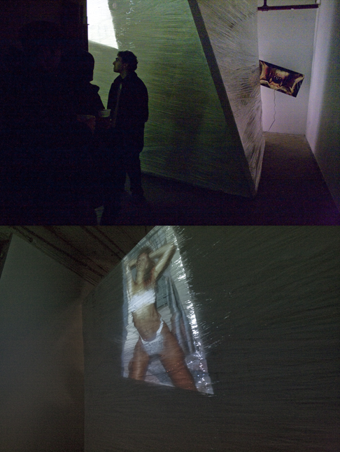 Suspiciously billed as “CG Haiti live gesamptkunstwerk with stage production by Humalode LLC,” Copy Gallery’s first Friday shenanigans filled the small space. Loud music emanated from an irregular opaque packing-tape (cling wrap?) prism, just barely smaller than the room itself—think DIY Richard Serra with killer bass. The space between the prism’s planes and the walls of the gallery was just wide enough to act as an encircling hallway.