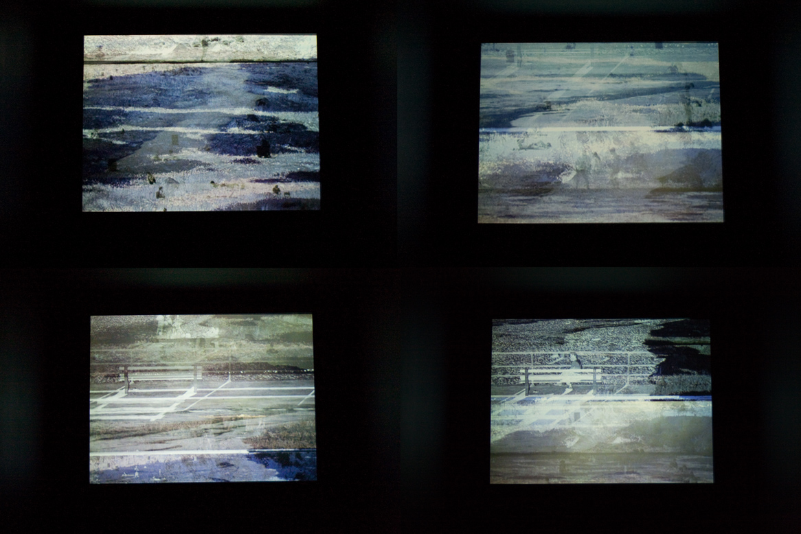 Pat O’Neill’s Horizontal Boundaries (2008), a 35mm film transferred to HD video for Screening, starts with a blank screen. In the darkened room, the sounds of city life hum, click, honk, and whir. They’re a suitable overture, as the screen lights up to an image as overlaid as the sounds. A scene of LA beachgoers reposing by, shuffling around, and crashing into the barely discernable ocean mixes with different views of the same scene and a still shot of debris on the sand. A lone figure on a bench sits, disappears, and reappears. California landscapes and crowds merge.