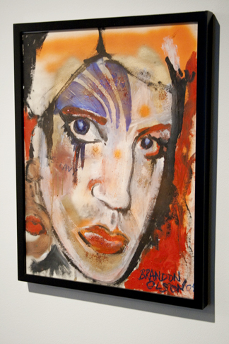 Brandon Olson’s Untitled (2004), an expressionistic and colorful drawing of an ambiguously gendered heavily made-up face, is as not as transgressive as its casual construction and material choices (glitter and spray paint) together seem to hope for. Nor is its polite gender confusion or declarative glaze really stepping on anyone’s toes. It’s been 7 years since Captain Jack Sparrow hit theaters, decades since Duchamp’s alt-gender alter-ego Rrose Sélavy entered the Philadelphia Museum of Art, and over a century since Olympia stared down some surprised salon-goers. That Olson’s piece features the word “Selavy” scrawled across a cheek does not legitimize it, but, rather, only confirms that its bite is borrowed.