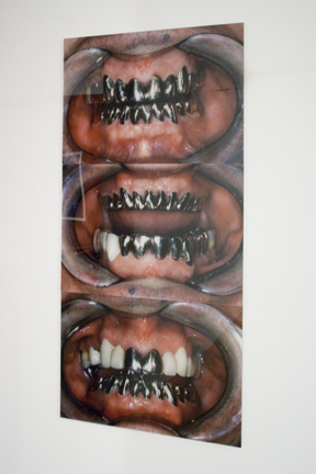 At first, it appears to be three impersonal medical images of patients with decreasing numbers of false teeth. But the unusual quantity and color of the teeth, coupled with a persistent mole, reveal that the series of photographs depict the same mouth.