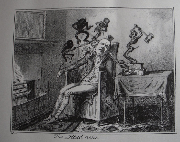 A small exhibit of works by Chagoya and his 19th Century counterpart Cruickshank was on view briefly in February at the Rosenbach where, over one weekend, the public was invited to come in, take a look, hear the artist speak about his work, and participate in a watercolor workshop to hand-color a black and white offset print version of Chagoya’s The Headache. I picked up the offset print, a great giveaway, and took it home thinking well I may or I may not color it in. It’s pretty great just as it is. I gave it to Stella who is also unsure if she will color it in or leave it black and white.