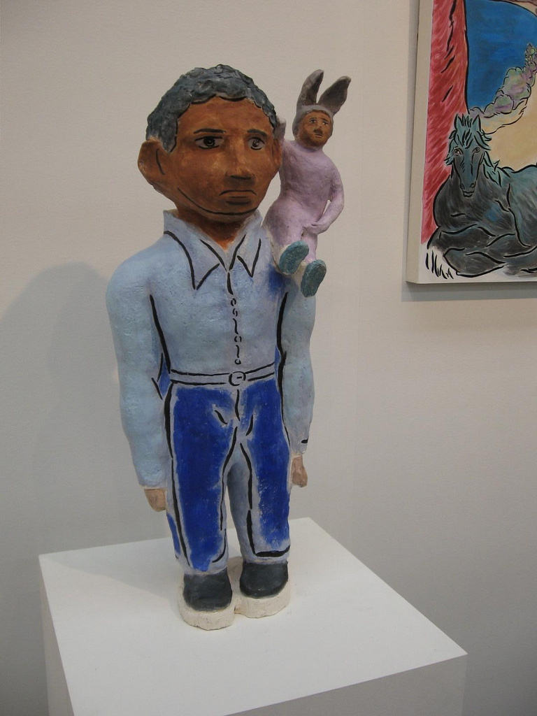 At Rena Bransten Gallery, John Bankston’s likable cuddle-sized sculpture of a sad man sporting a bunny on his shoulder cut the usual Bankston sting with a barely ironic bit of zip a dee doo dah.