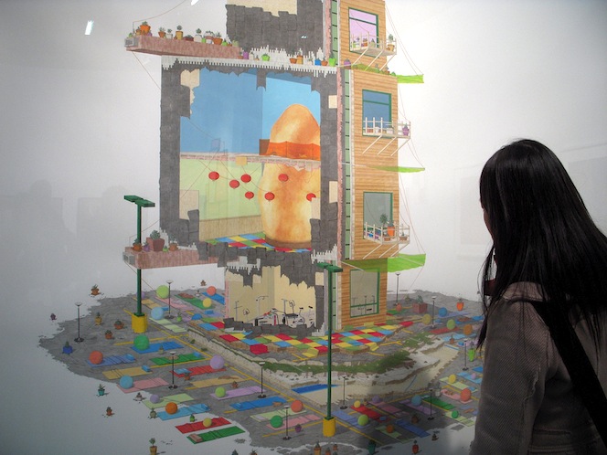 Finally, the irreverent wit — and flat world style — of Peter McDonald at Gallery Side 2 reminded us of Jayson Scott Musson’s set of Obama paintings on view last year at the Last Drop coffeeshop. McDonald, the gallerist told us, lives in London and just won the Moore Prize. How did McDonald get a Tokyo gallery? Well, the artist was born in Japan and his mother is Japanese and he goes to Japan frequently to visit.