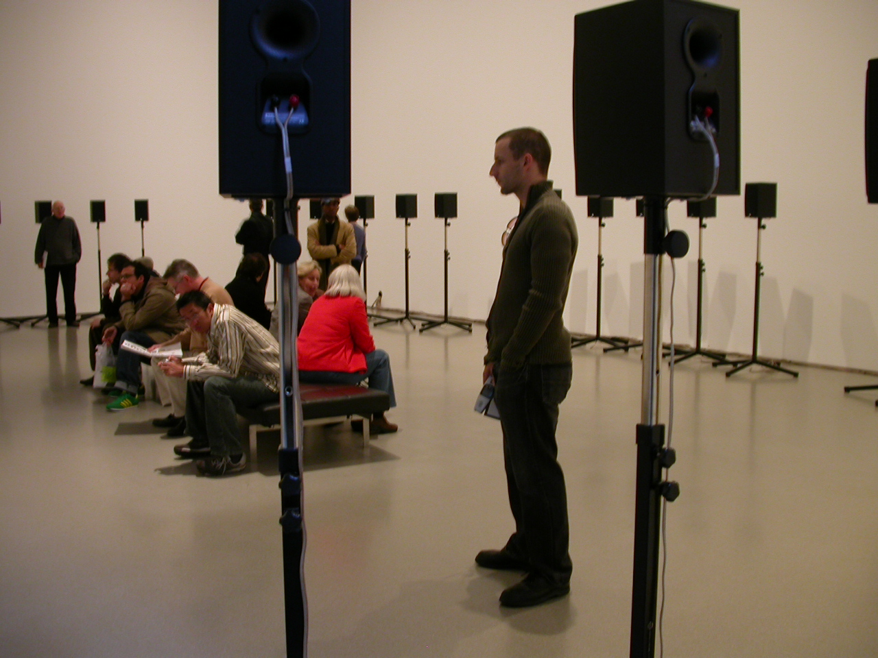 The English version, Days, in the main building, is squeezed into a relatively small gallery. There the rectangular speakers become a pedestrian but too-important presence that raises the question, Why does this look so homely? After all, the hardware is no homelier than Janet Cardiff and George Bures Miller‘s 40-Part Motet at MoMA. Again a large space was an important factor. And so was the beauty of the music. Even though the speakers were a major visual presence, they helped people the large space.
