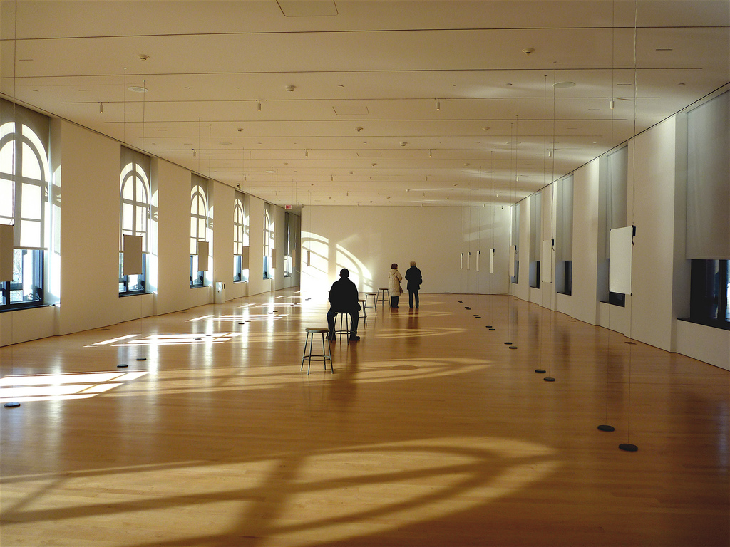 The Italian version is transcendent. To see it, you will have to cross the Parkway to the Perelman Building. The gallery there is a glorious, large space. There the sun streams in through the arched windows, and the flat, rectangular speakers become milestones in a journey you take on foot across the alley of speakers. That sense of a pathway and a progression is critical to the success of the piece. The arched windows and shadows emphasize that sense of an arcade, a pathway through life.