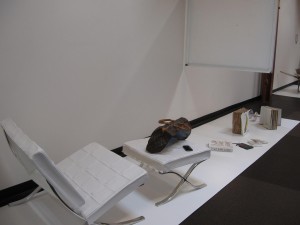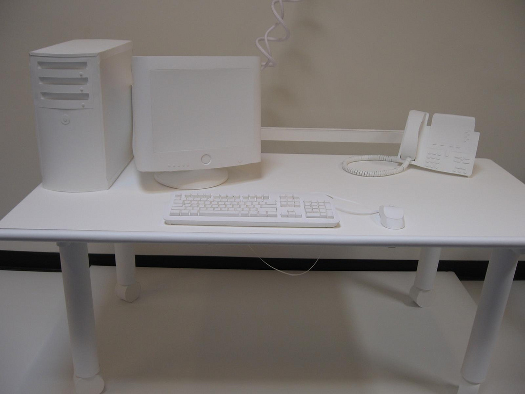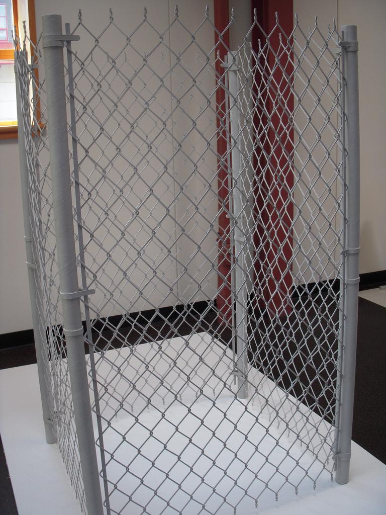 The exhibit also favors tight and white, as in crisp, clean lines and no floppy, sloppy workmanship and blindingly blanche neige color schemes. David Almeida‘s C-prints of dime store replicas of natural objects are pristine, Audubon-like taxonomies on white backgrounds. Sarah Kabot’s white paper sculpture of an SEI Corp. work station — it could be a workstation from anywhere — is a ghost of a thing.