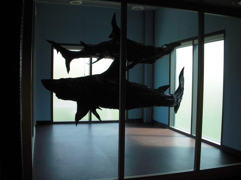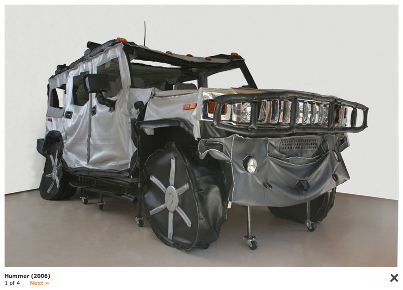 Among other things it was great to see Alex DaCorte’s huge pile of snakes and Margareta Cabrerra’s stitched fabric 1:1 scale Humvee in the “wealth” area (SEI is a financial services company) and the patchwork mutant sharks made of scrapped rubber tires by Yong Ho Ji, in an airy corporate glass cubicle.