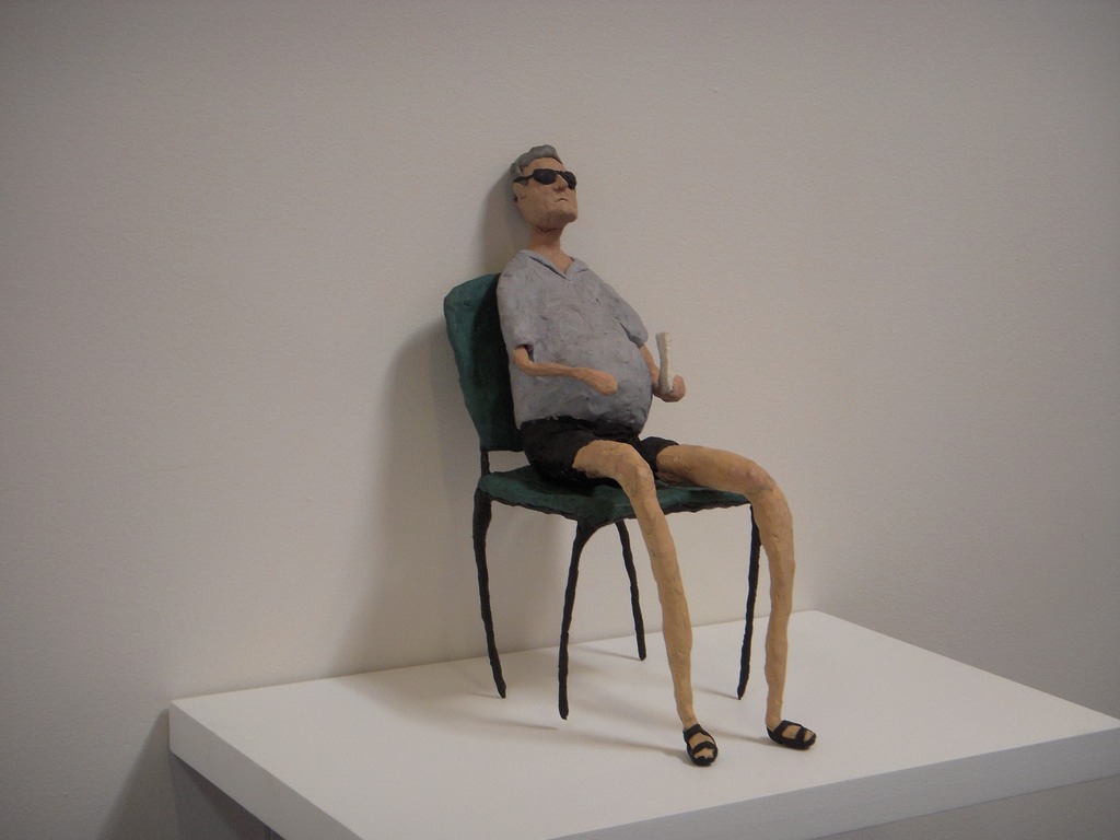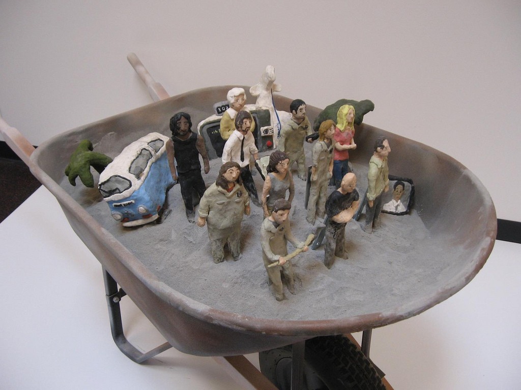 Revital’s plasticene pieces mix the utterly believable with the utterly unlikely. She took this wheelbarrow, a scenario from the TV show Lost, out on a beach somewhere and allowed people to touch the figures, Stoetzel told us, giving random people a kind of authorship of the piece. Stoetzel told us they thought that was really special and we agree. Falke’s interest is in the everyday. Bringing the Lost characters into the real world on the beach makes them lost — and found — without losing their Lost-ness. We love that.