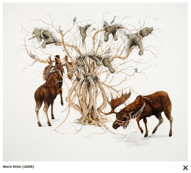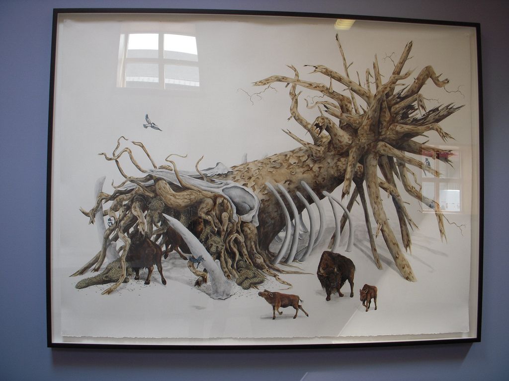 Last year the $25,000 prize went to the Dufala brothers for their Ice Cream Truck — a truly wild piece of art and a risky choice for the winner, both because it conflates ice cream, childhood, capitalism and war, but also because it’s a rough-around-the-edges piece that is anything but beautiful. Prizes are awarded for many different reasons and speculation is pointless. While we were impressed that the prize couldn’t be typecast as going for only one kind of art, we thought this year’s choice was less risky than last year’s — although it sure does affirm certain threads running through the West Collection — like their interest in art about the ecological mess we call earth and their consistent love of finely-crafted and beautiful drawings.