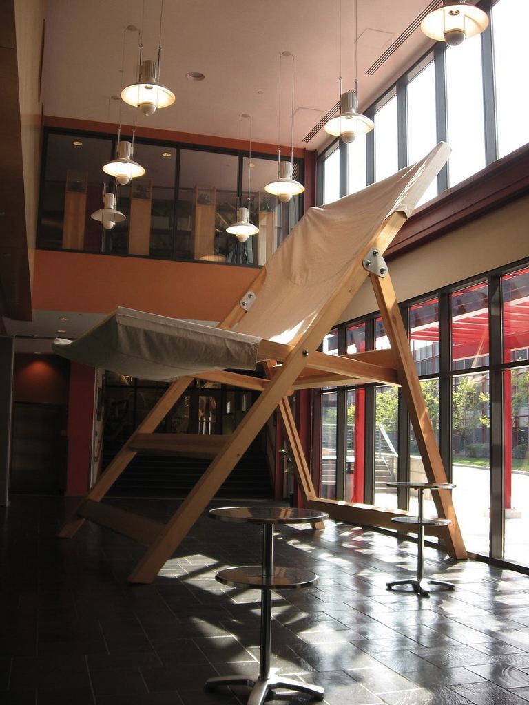 Also hanging in one of the big sunny atriums were Norm Paris‘ installation of Michael Jordan trying to save the world from nuclear war, Tristin Lowe’s great big slingback chair (a prop waiting for a movie), and, around the corner, the Dufala brothers’ Ice Cream Truck. (See the artists of the West Collection here.)