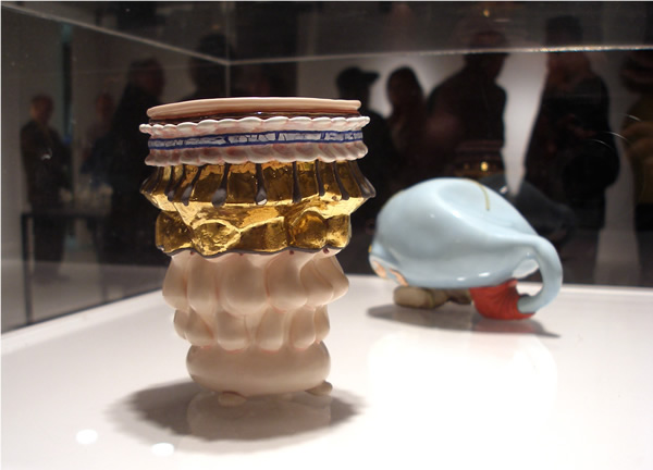 For clay drama and dumplings head over to Locks Gallery. The mix of work by Betty Woodman on the second floor and Jun Kaneko, Kathy Butterly and Jill Bonovitzon the third is a treat. The small cup-like forms of Butterly and Bonovitz work well together because of their similarity in scale and shape. Both are adorned with flourishes reminiscent of George Ohr.