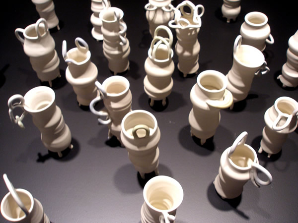 Bonovitz’ cups line up all in white along a wall of the gallery or group together on a black plinth, easily achieving the qualities of a crowd—homogeneous when seen together, deeply individual on closer inspection.