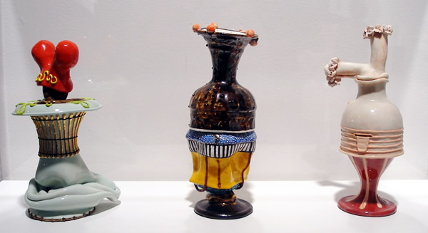 The show is punctuated with six of Jun Kaneko’s semi-monolithic dangos. These range from two to three feet high which is large for hand built ceramics, but small compared to his record breaking works more than thirteen feet tall. In comparison these are really approachable dumplings.