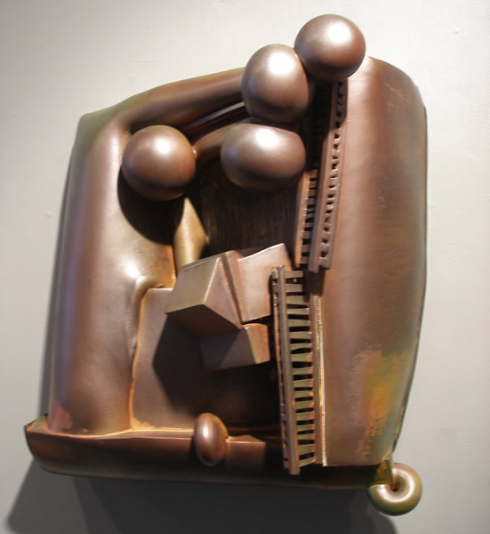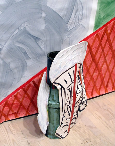 Woodman’s work contains elements of all three of the others in the show as well as something more. For one thing there are the large paintings that occasionally serve as backdrops for her gestural vases. These paintings echo the colors and forms on the pots and also play with the flat surfaces that jut out from the clay as though each pot were growing a painting out of its shoulder. Her colors and brush strokes combine so many styles and traditions that it’s easy to play name that influence—Matisse, Italy, ancient Greece, Frank Stella, majolica, funk, and on and on. There were so many large pieces in the main room that it was a springtime feast. The Green Picture and the Yellow Vase reminded me of stage sets for plays staring vases.