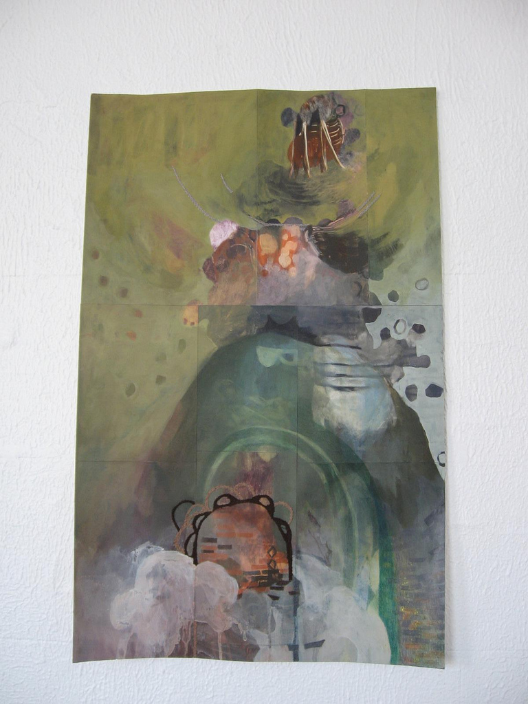 Also in the show are semi-abstract monoprints painted and stitched by Erin E. Castellan.  The paper is folded and hung unframed. The colors of the paint are just this side of muddy; the shapes are barely suggested.  Together, they create a hazy atmosphere that only reveals beauty through hard looking and light.