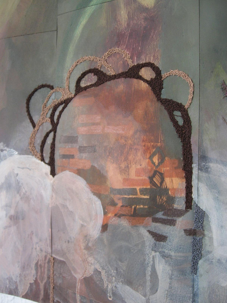 The bricks too must be viewed through the haze. The actual stitches, however, are not in the least hazy. They hold the atmosphere and the paintings in place with their almost manic density, giving bones to the paintings’ dreamy architecture of dells, castles and rainbows as if the mind is imposing its ideas on a fragile, ephemeral world.