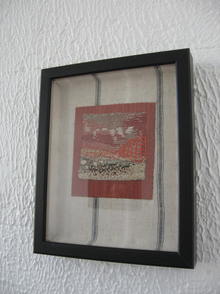Some of her backings are highly unlikely–wide, a-symmetrically placed stripes, nubbly rich greens that bring to mind some awful curtains from my past. The backings are stitched to the back and folded toward the glass to create a shadow box. This too seems unlikely — contrarian and maybe too crafty. But the small, intense stitching delivers passion at a modest scale; they are antidotes to Peter Doig.