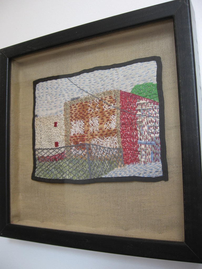 Marie Elcin paints Philadelphia with stitches, creating portraits of decrepit street corners and swatches of nature that flourish next to industrial wastelands and rubble. Her stitches capture the jittery patterning of fences and bricks and gravel.