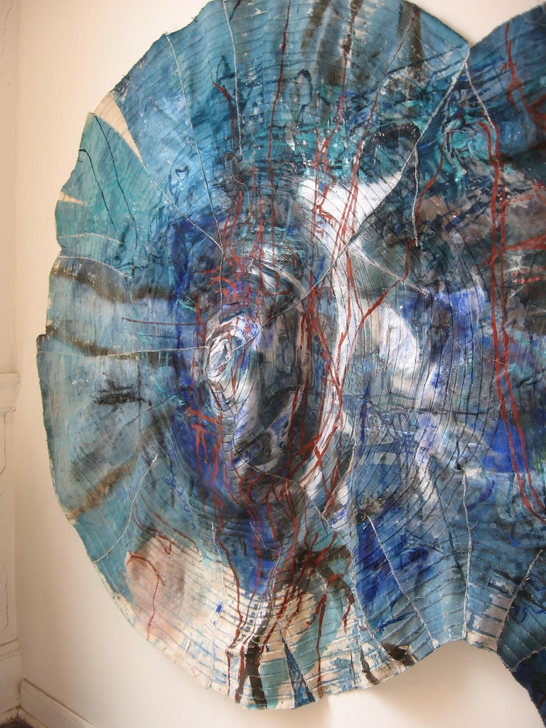 Colleen McCubbin Stepanic, detail of Bound, acrylic on canvas, sewn. I would guess this section of the figure-eight-shaped piece, which was inspired by the cross-section of two tree trunks that grew together, is more than 3 feet high, I think. The other half is even bigger.