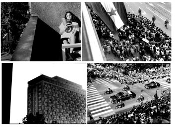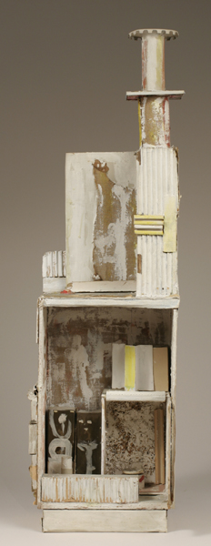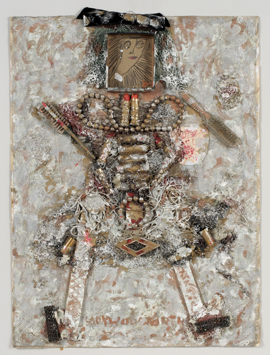 The most interesting work in the exhibition are her many collaged constructions, which owe a debt to her knowledge of Kurt Schwitters’ work as well as Rauschenberg’s Combines and probably Joseph Cornell’s boxes, and the relics and documentary photographs of her performances. She often incorporated dime-store cosmetics in the collages (thirty years before Janine Antoni), and made humorous commentary on stereotypical female roles. Lady Woolworth incorporates lipstick and brushes – the better to present herself – while pearls outline her breasts and pubis. She did anti-Vietnam War performances with the participation of the younger artists who circled around Judson Church’s performance space.