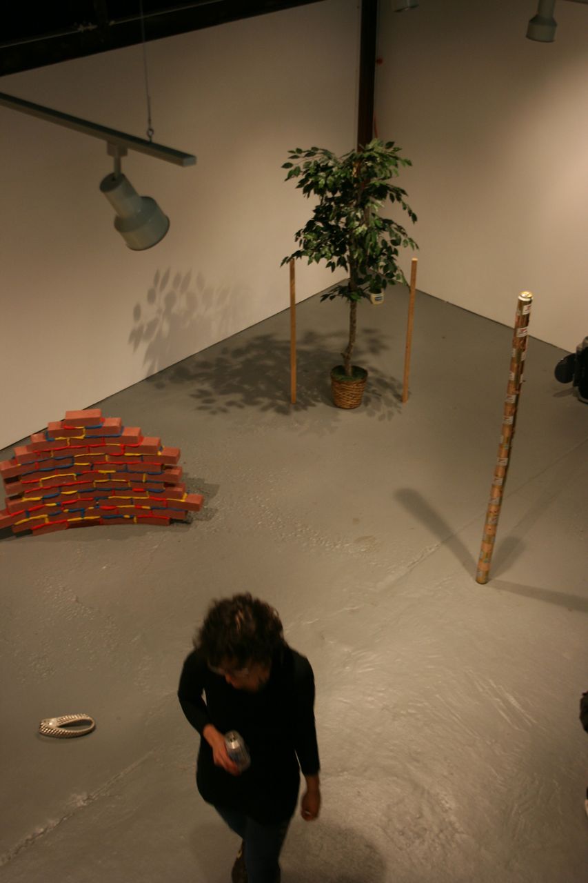 ExtraExtra was the place to get your contemplative kicks. Their new show, Soft Focus, is a grouping of objects spread sparsely across the gallery floor. Installed by Derek Frech, Joseph Lacina, Bob Myaing, and Daniel Wallace, ExEx’s founders, they range from single objects (a studded-belt) to more complicated pieces (meticulously-arranged rainbow of PMA buttons). By placing the objects on one plane, the four hope to decontextualize, and therefore, recontextualize them. Rather than look at the array of PMA buttons as a piece unto itself, we are meant to see it in the context of the objects that surround it. The four artists challenge us to make fresh connections, and there is a lot to be said for this idea, but the simplicity of some of the objects (a tower of beer cans) don’t seem to lend them well to this endeavor.