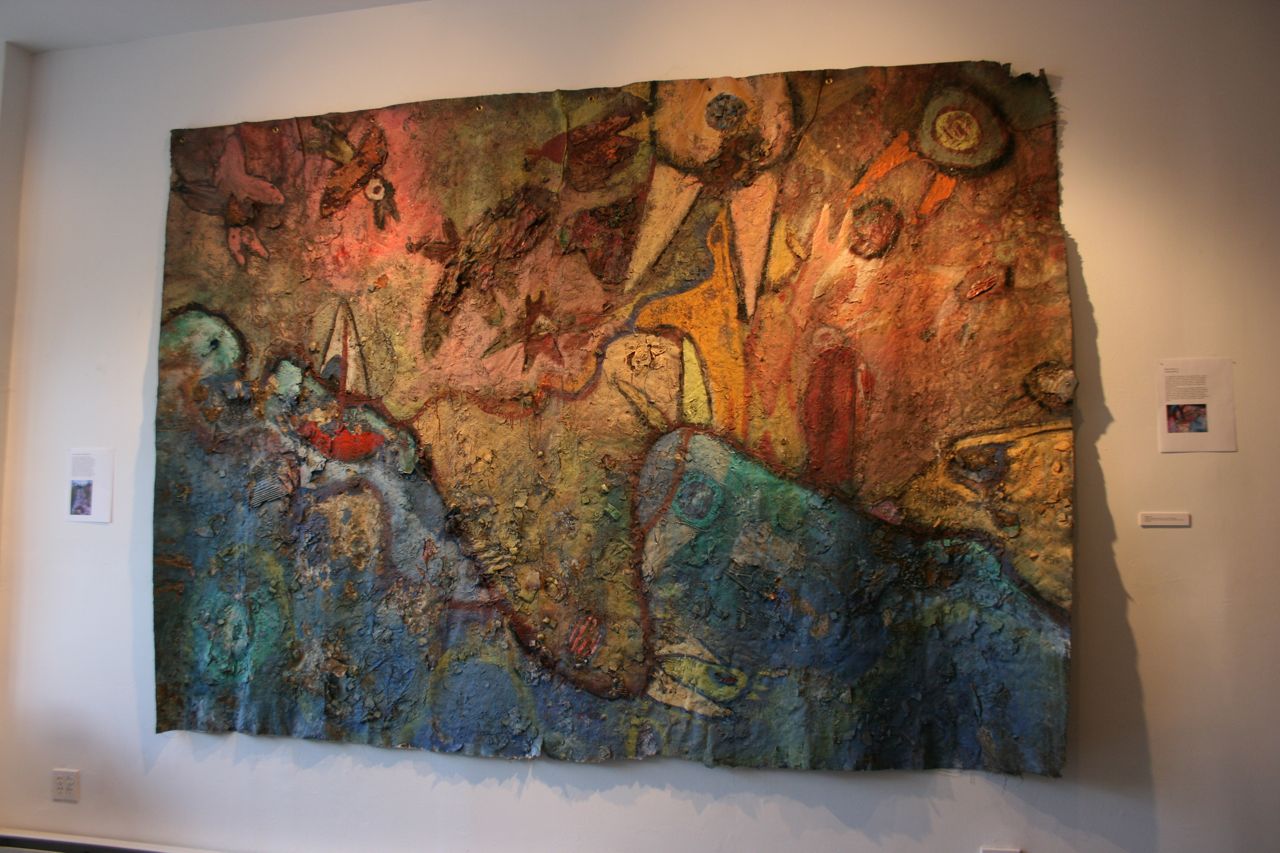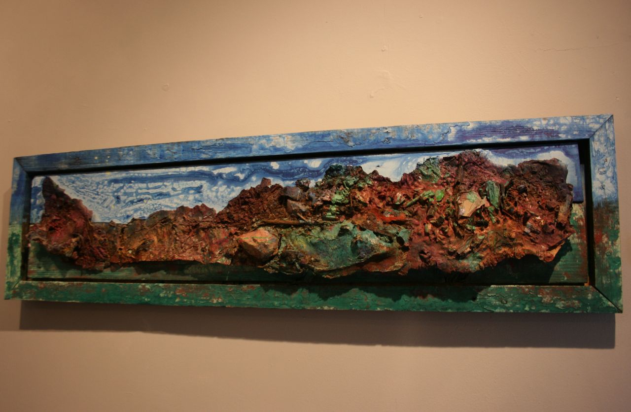 Waring’s weathering process also does interesting things to canvas shape, especially the show’s pièce-de-résistance, Rising Up, which undulates pleasantly. Up close, it’s studded with acorns and scrabble tiles, and from a few feet back, it’s a beautiful tapestry, nicely highlighting Waring’s play between nature and art.