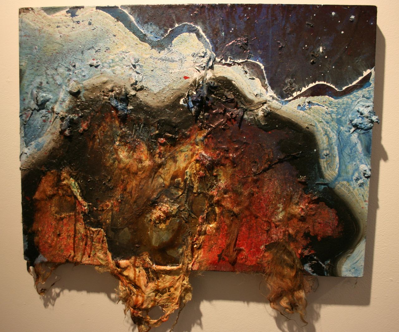 The most visually interesting of what Frankford Ave. has to offer this month is Jeff Waring’s Becoming and Unbecoming show at Highwire Gallery. Waring’s method is something like lather, rinse, and repeat. He combines natural and man-made materials on a canvas, leaves them to weather in the sun and rain, and keeps layering, layering, layering.