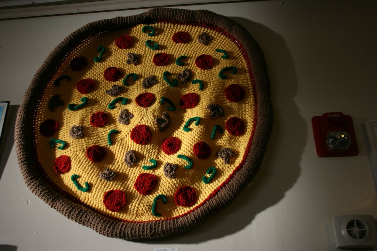 Joshua Camerote’s video art ‘The Sun Never Sets on the Za Empire’ played in the corner, with pizza worked into borrowed footage, replacing things like turntables and the two suns that Luke Skywalker gazes at in Star Wars. Alexandra Jones has knitted a very appealing, giant ‘Yarn Pizza’ that I wanted to take off the wall and wear as a blanket.