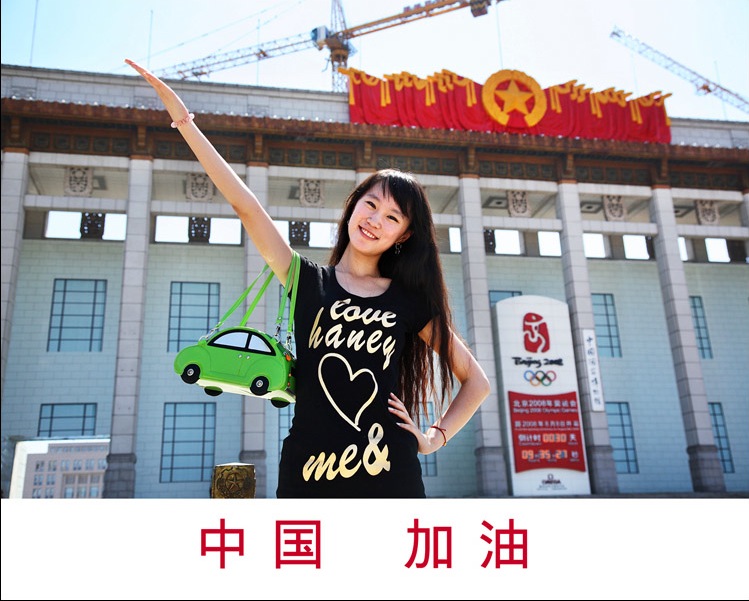 Many of these images also allude to the arrival of the Olympics in Beijing. In China, Add Gasoline, you see a young girl standing in front of the National History Museum at the edge of Tiananmen Square. Beside her is an Olympic countdown clock. The title, a common Chinese sporting phrase, is similar to “Let’s go!” or “Step on the gas!” However, paired with the green Beetle bag on her arm and towering cranes above, it acts as a reminder of China’s large gas consumption in an effort to develop its economy. During this time, China had a stronger sense of national pride, but was also acquiring a new level of tension, due to their hopes of impressing and re-introducing themselves to the world during the much-anticipated games. The museum represents China’s long history, while the youth points in the direction of the country’s economic future.