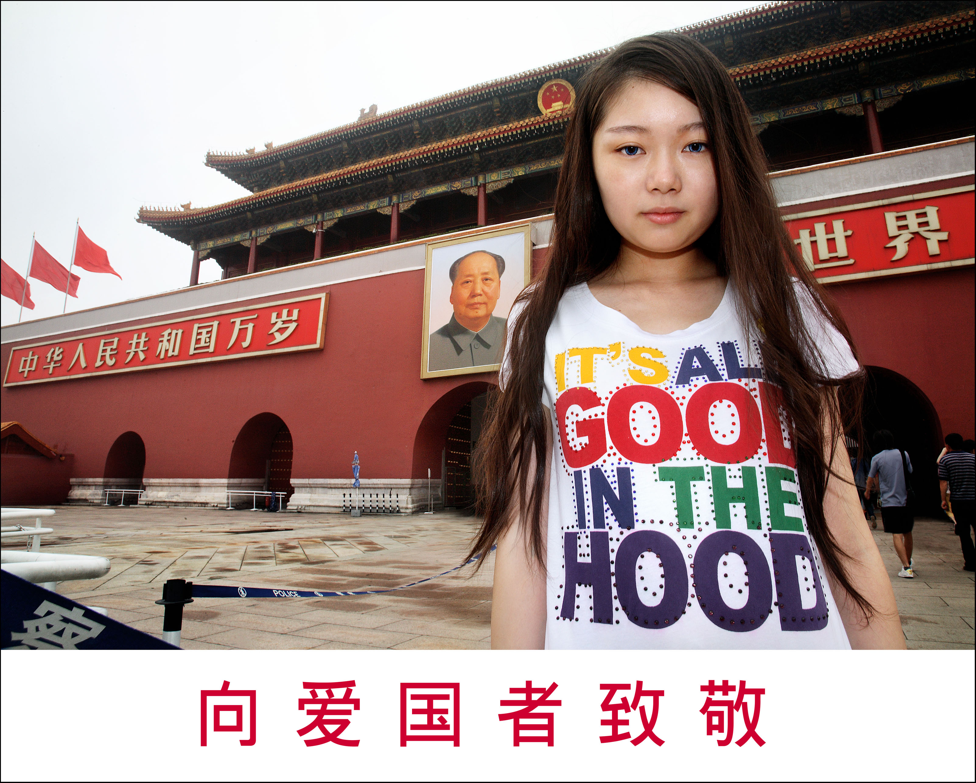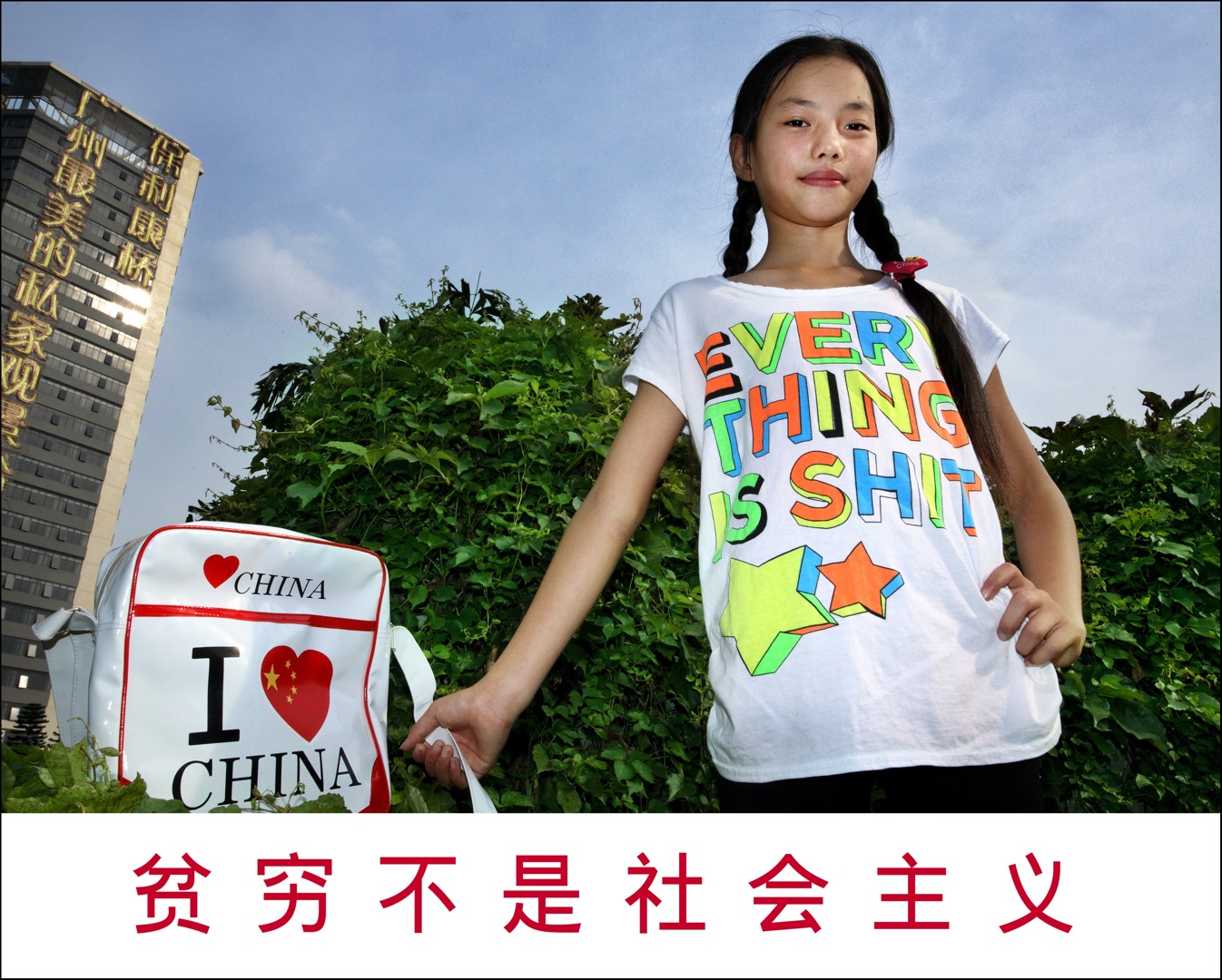 In Poverty Is Not Socialism, a young Chinese girl is shown wearing an “Everything is Shit” t-shirt written in upbeat, colorful block lettering. The shirt’s large stars echo those in the heart on her “I Love China” tote bag, alluding to the flag of China. The title of this work is taken from a famous statement made by Deng Xiaoping in 1984, in support of his new policy of reform and “opening-up” of China. O Zhang wrote that, “he didn’t know how right he would be, [and the] Chinese realize this now.” Combined, the image and texts create a deceivingly playful call for political revision. The scale of the young girl, in respect to her backdrop, may represent the strength and importance of the country’s youth in making these changes possible.