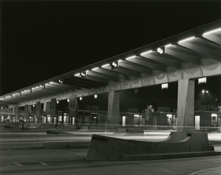 In Toshio Shibata’s exhibit Expressway the human form is invisible but implied. We are looking at the works of man and the light tracks left in the wake of the cars in which he travels. These 11 works are nightscapes of highways, rest stops, and toll areas, most of them in Japan, but really places without countries. They are everywhere and nowhere at once, detached from the daily experiences of chores, responsibilities and relationships.