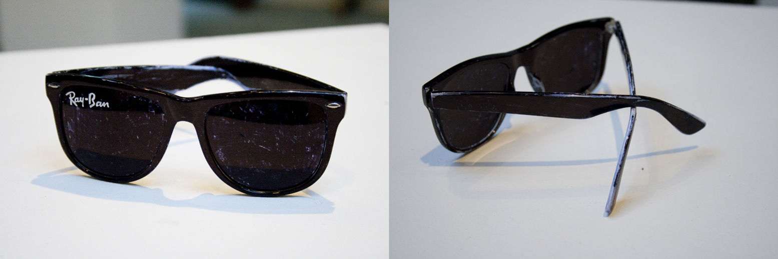 Ultimately, it is the choice of sunglasses, rather than the artist’s modifications, that carry the most visual impact. The Ray Ban style, made famous by 1960s American bohemians, but since turned into a global brand capitalizing on its former patronage, is, as its advertisements claim, iconic. Reading Heinly’s piece: (your)-cool-glasses-are-art-duh, rather than as a rehashed critique of authenticity, “Fake Ray Bans” comes off, somewhat for better, as flippant instead of stale.