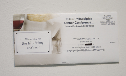 Founding member Beth Heinly’s work in Forecast takes us to another popular mode of contemporary art, the appropriation art, reconsidered. Heinly presents a piece of junk snail mail she received, taped to the wall, as a stand-alone piece: “Mail from the Internet.” It is not devoid of interest—the spammer seems to have mistaken her internet moniker “Berth Heiny,” for her real name. Moreover, the oddly convivial tone of the text—“Dinner Table For Berth Heiny and guest”—coming from impersonal spam mail is undoubtedly funny. Like stolen wifi, just out of range, Heinly’s piece almost ushers us into a web of associations, but fails to provide reliable connectivity.