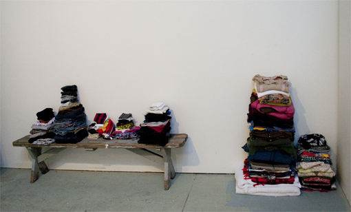 Collective co-founder Martha Savery’s equally un-makerly piece “Laundry Configuration #4013, Things we won’t be wearing this summer” is more interesting, but feels unresolved. Savery took winter accoutrements and folded those clothes into basic piles at the back of the gallery.