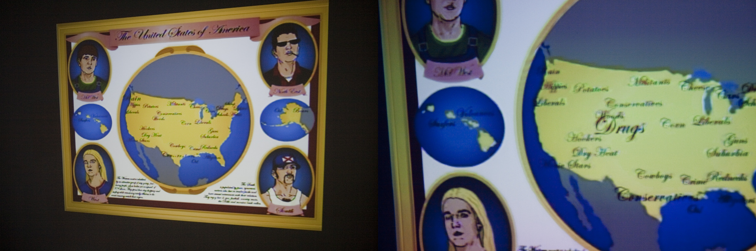 In founding member Robert T. Panell’s flash video, “Map of Stereotypes,” the formats of informational documents—history textbooks and PowerPoint-esque flash animated-graphics—are used to present information we typically try not to know. Panell’s map of America names the stereotype, rather than the place, associated with the geographic region corresponding to the position of the text. These words, animated, grow and shrink to showcase one stereotype at time. The word “Liberals” hovers over San Francisco, “Militants” over North Dakota, “Potatoes” over Idaho, and “Corn” over Iowa. The fact that most of us will recognize how these words might be applicable to those regions—regardless of whether or not we truly believe the meanings—forces us to feel a bit implicated in their continuation.
