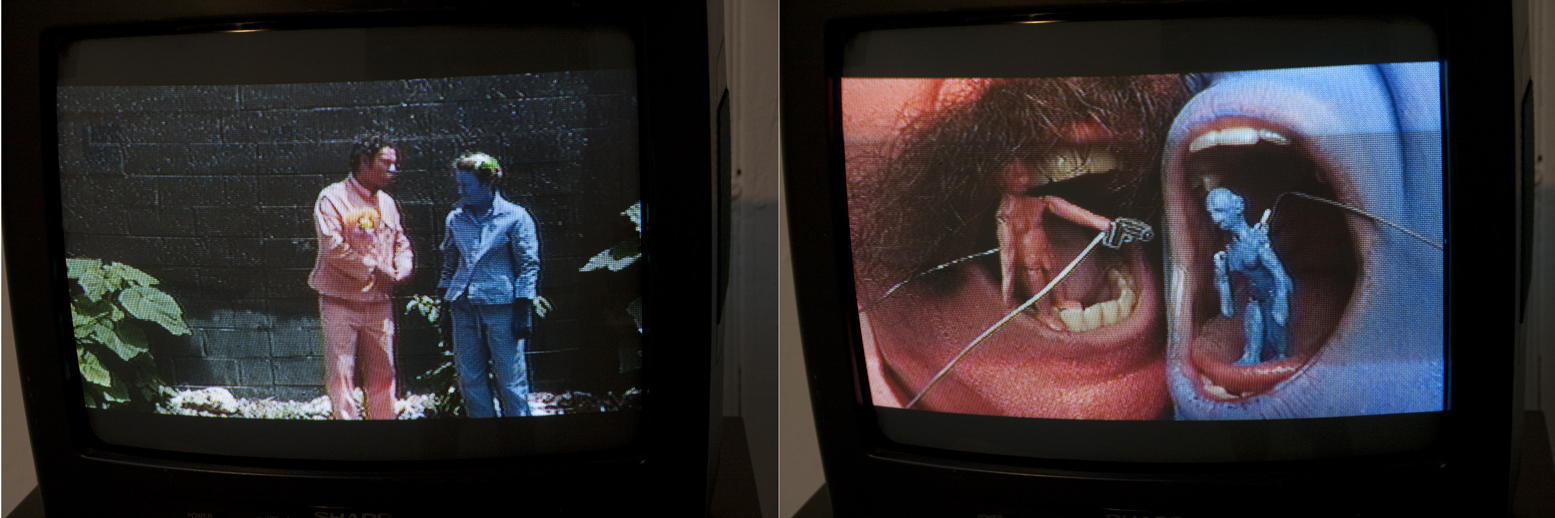 In “The Meeting” the puppets in the mouths—inanimate things—carry out the main action, while the literal bodies of the actors—the interiors of the mouths—become the stages. Rogers’ inversion of the typical relationship between actors and sets captures the logic of a mugging, where the participant’s material goods—a wallet and gun, respectively—have all the agency, while the participants bodies—an itchy trigger finger and pumping heart—become the sites where action might occur.