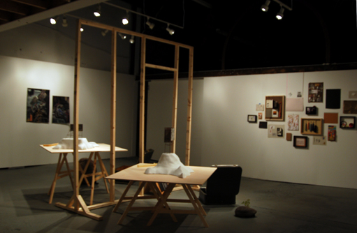 As visitors enter Nik Pence and Alyse Ronayne’s installation “Liminal Refraction” at Extra Extra Gallery, they may feel as though they have stepped through Alice’s looking glass. A large wooden frame constructed by Pence divides the gallery space into two halves. This frame at first seems to signify a mirror. Two suitcases have been positioned on either side of the structure at similar angles—as have two rocks, two hammers, and two overturned plants. At closer range, however, it becomes clear that the objects on either side of the frame are not quite identical.