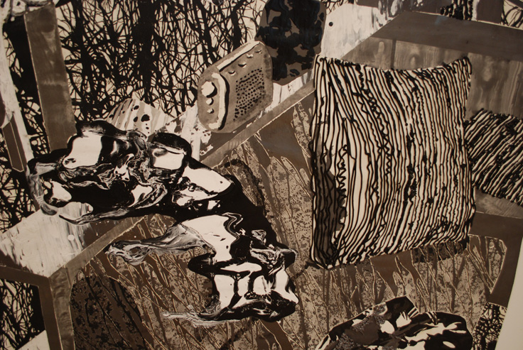 Doron Langberg’s massive mixed-media pieces on paper greet audiences towards the main entrance of the show. While the dynamism in these 2-D pieces resides in Langberg’s play of black-and-white textural patterns, these hypnotic details disguise erotic scenes, which reveal themselves within the negative spaces. The subject matter can deliver an almost-embarrassing, subtle surprise to innocent eyes.