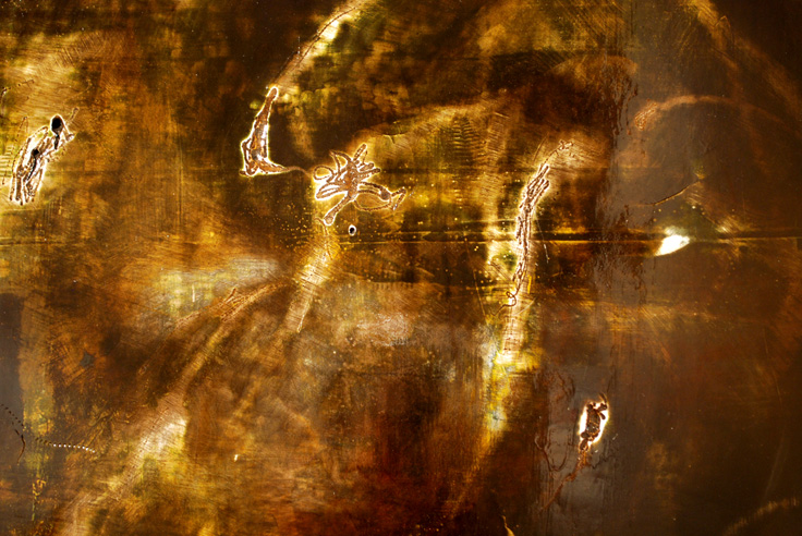 The surface of Justin Baldwin’s ethereal abstract paintings have been sanded down and carved into after being sealed under layers of resin. The paintings are successful because rather than seeming forced, they emerge almost as natural as breath, yet traces of the struggle for a final image resonate under the shiny surfaces.